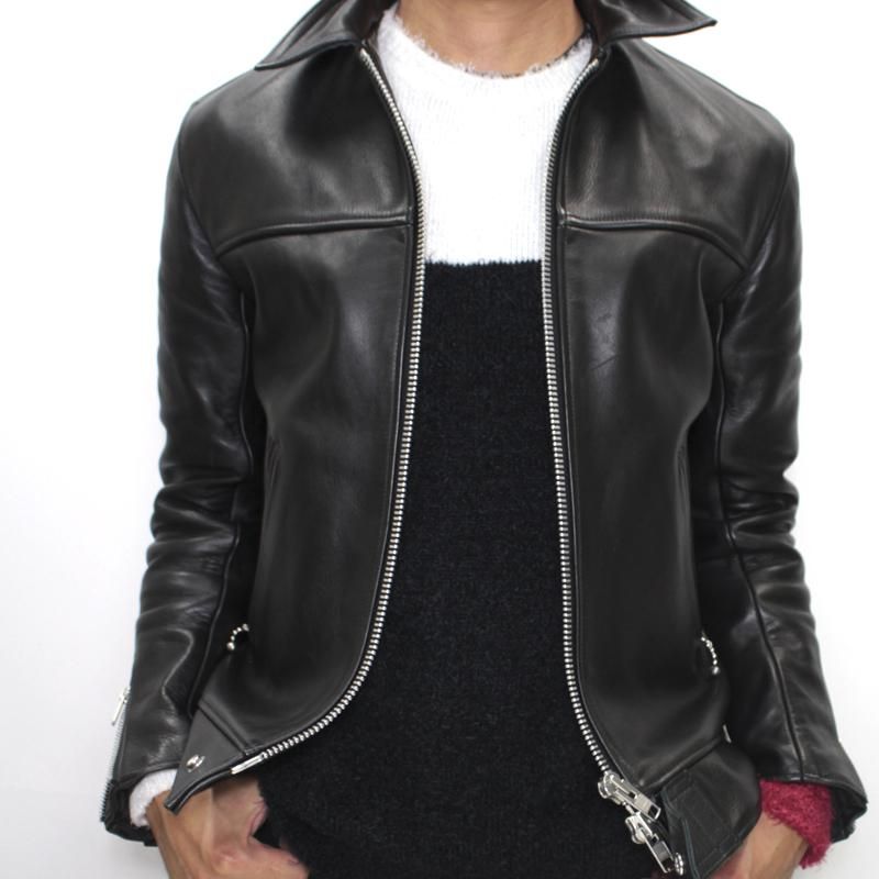 シープスキンは他の革に比べて軽くて柔らかいのが特徴です。軽量で柔らかくしなやかなことから着心地に優れ、街着としてのライダースに最適です。厚さ0.8mm〜1?を保持した、クロム鞣しの後にタンニン鞣しを施した両者の長所を合わせ持つコンビネーション鞣しという手法でなめされています。顔料を含まない透明感のあるアニリン染料で染め上げ、銀面の風合いをそのまま残し上品でソフトな質感に仕上げています。
