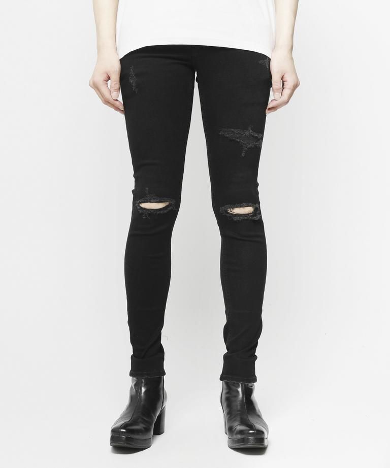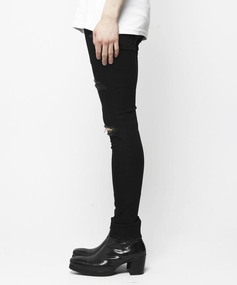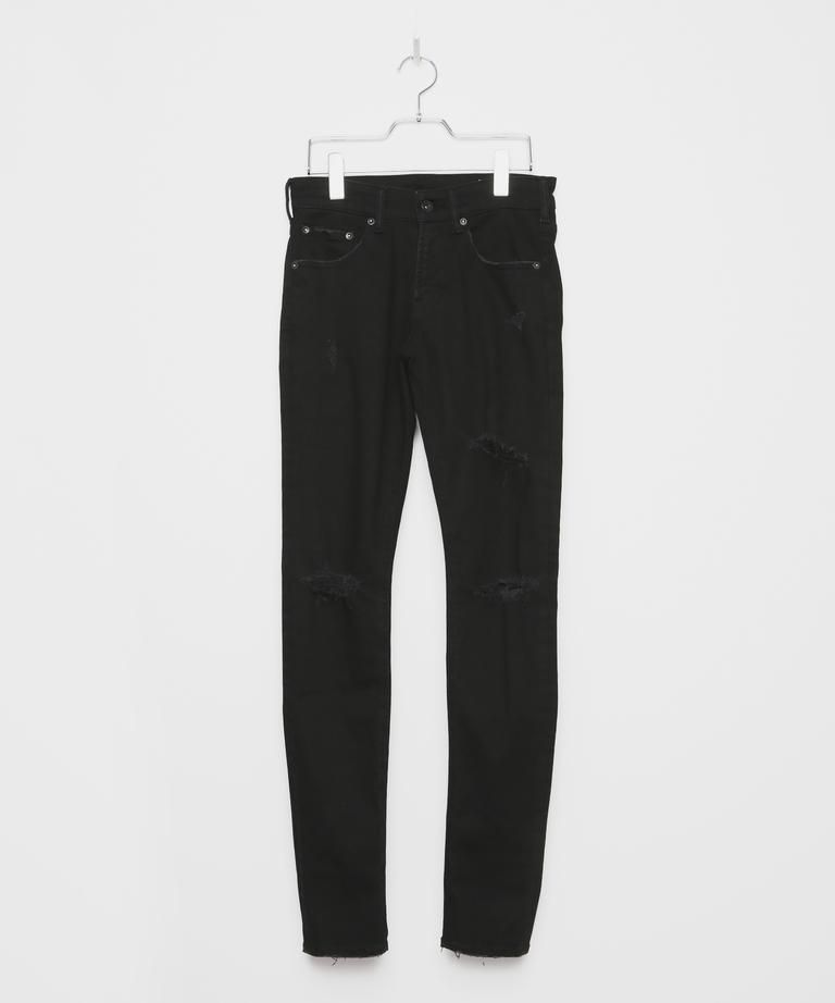 レジェンダのブラックパンツ。 ブランドスタート当初より根強い人気を誇り続けるスキニーシルエットのブラックパンツの最新作。 これまで同様にかなり細身のシルエットながらストレッチがしっかりと効いた生地を使用することで履き心地ももちろん良好。さらに加工もポケット口や裾のアタリのような風合いからのクラッシュや両膝や腿に糸を残しつつもしっかりとしたクラッシュ加工等も健在。 ブラック仕立てで股上も浅めの設定にすることで、スキニーながらもヒップから足のラインをすっきりと綺麗に見せてくれます。 ※クラッシュ部分は一本一本手作業の為、大きさや糸のほつれ方に個体差があります。不良ではありませんので返品交換等はお受けすることが出来ません。予めご了承下さい。 ※着脱時にクラッシュ糸が切れる場合がございます。修理等は出来ません。ご留意下さい。
