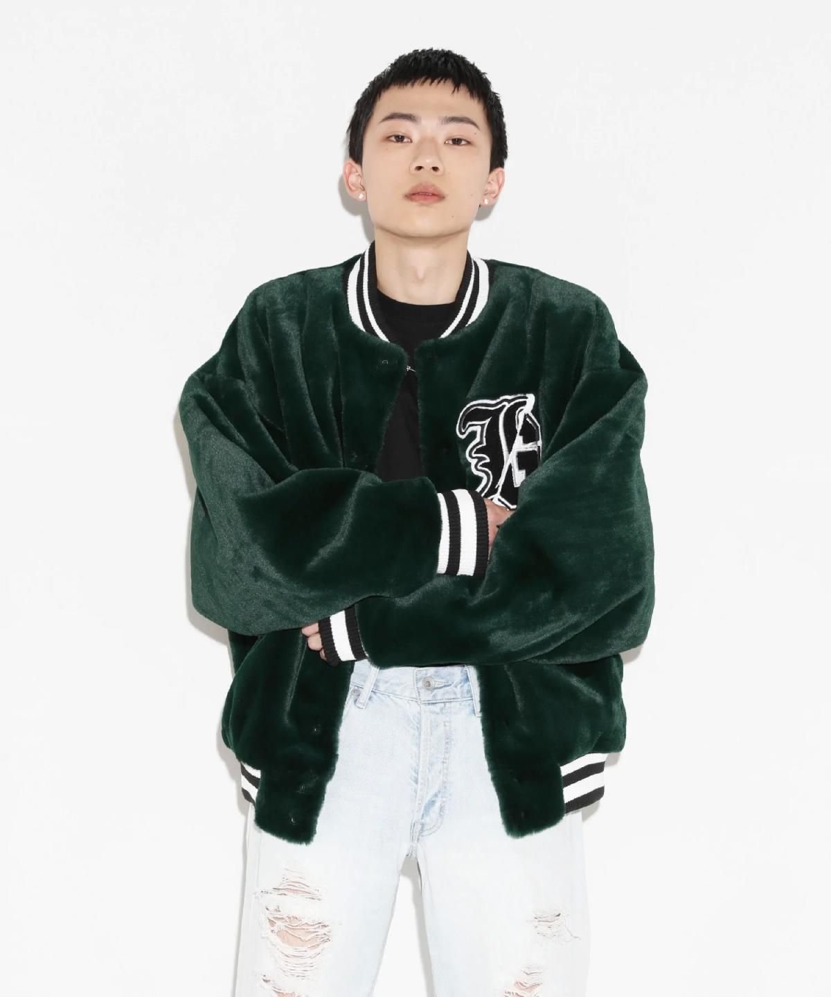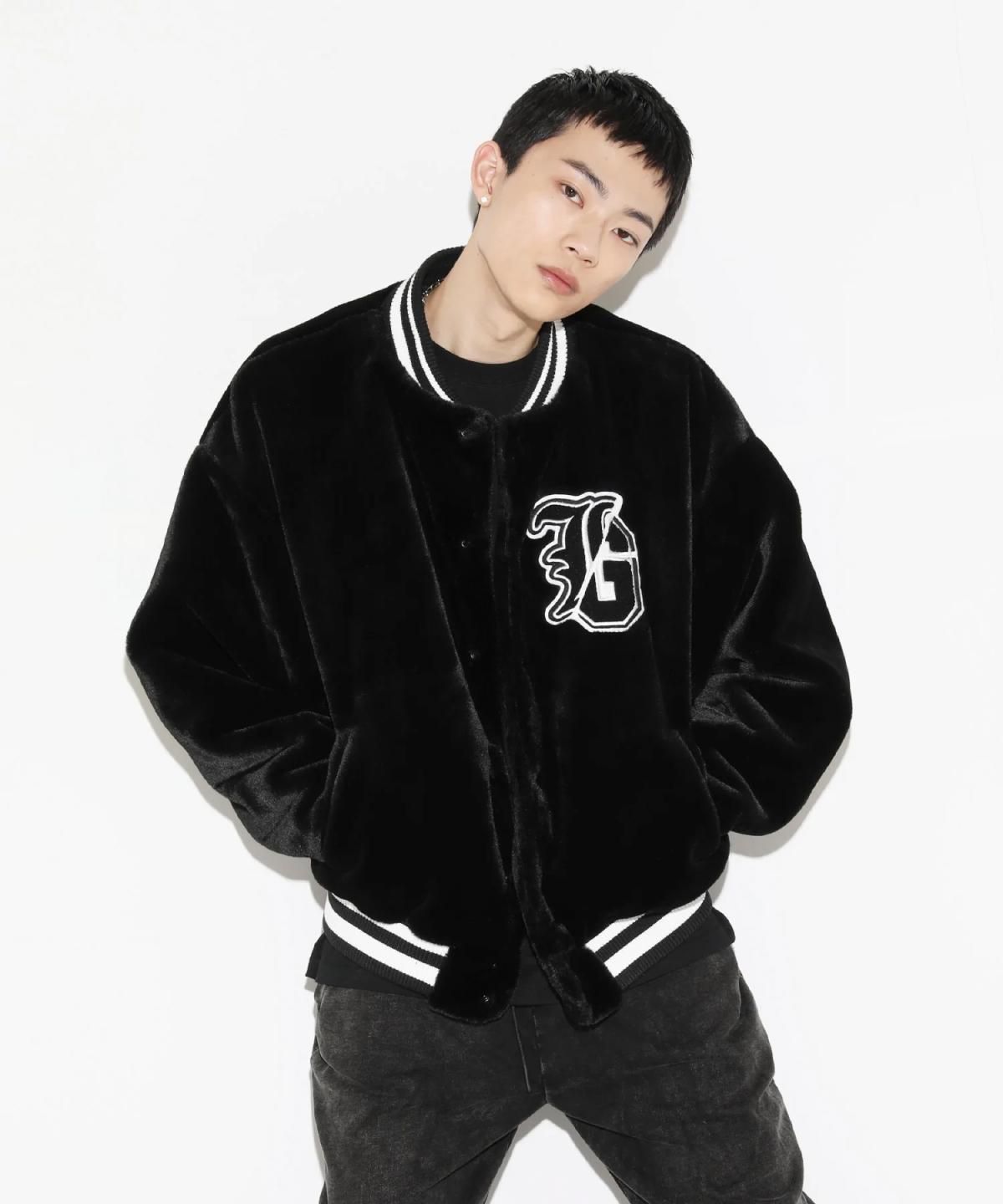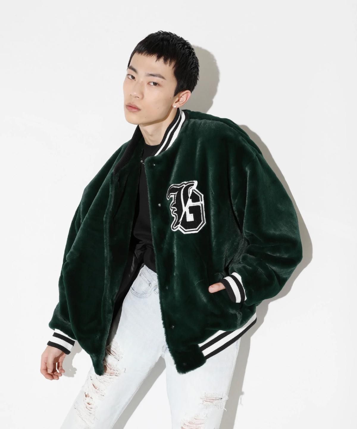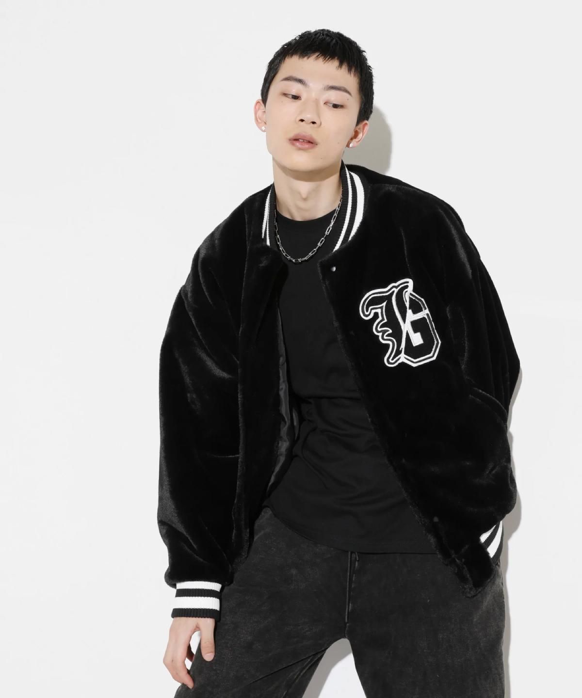 手触りの良いフェイクファー生地を使用したアワードジャケット。