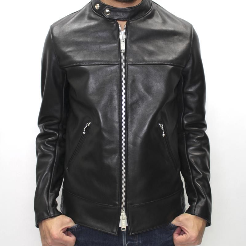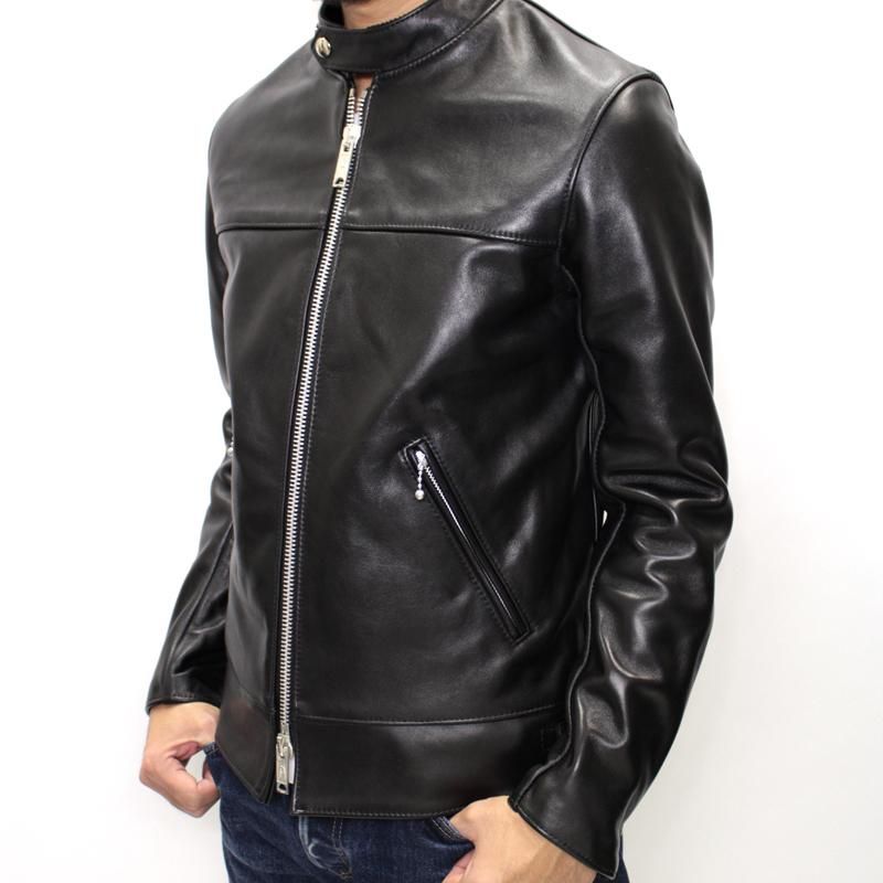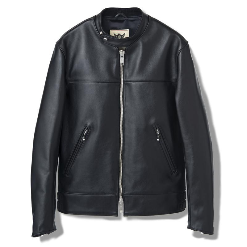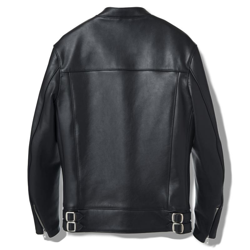 マンダリンカラー(立ち襟)と、後方に向かって付けられたツインサイドベルトが特徴となったシングルライダースジャケット。