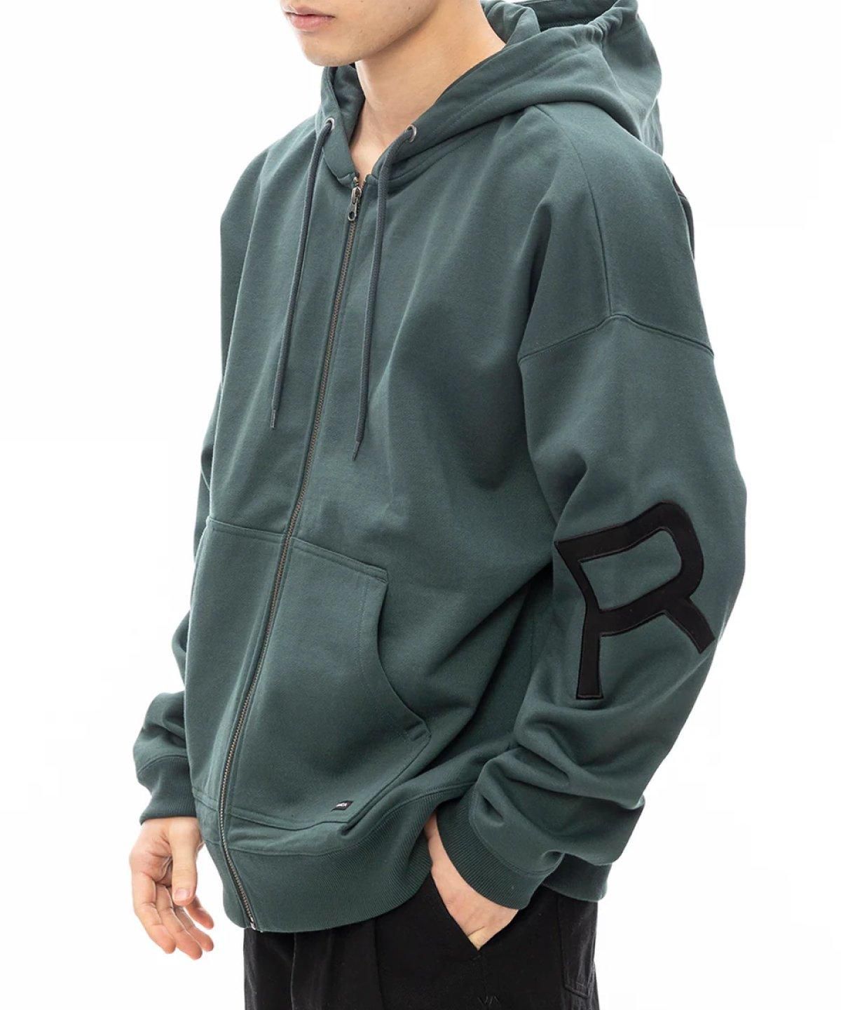 バックへ大胆にRVCAロゴを施したジップアップフーディー。