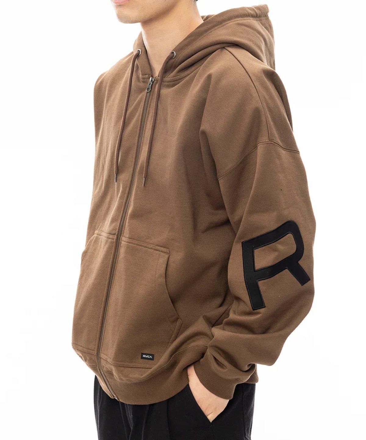 バックへ大胆にRVCAロゴを施したジップアップフーディー。