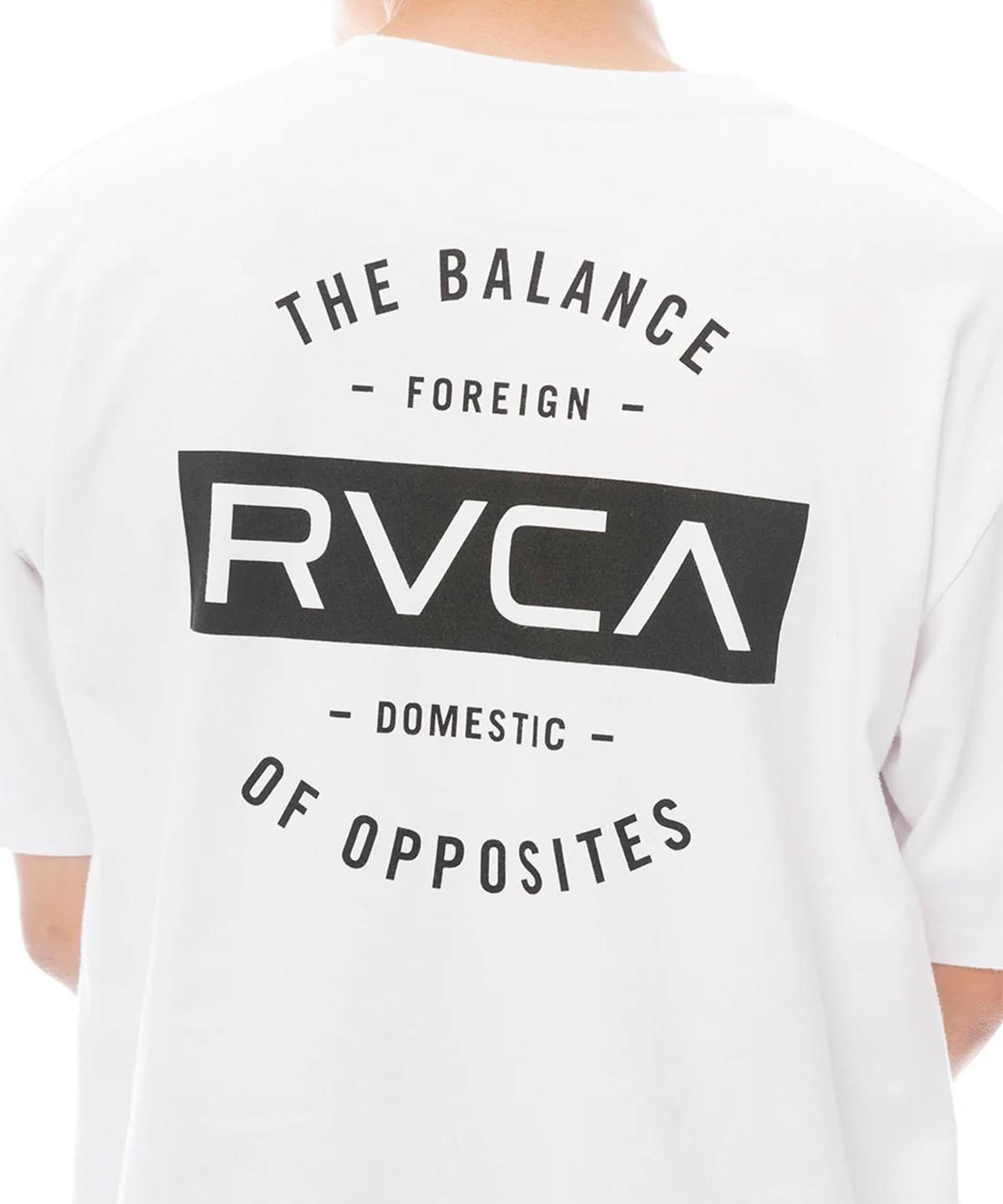 フロントとバックにRVCAと“THE BALANCE OF OPPOSITES”のメッセージをプリントしたクルーネックTシャツ。