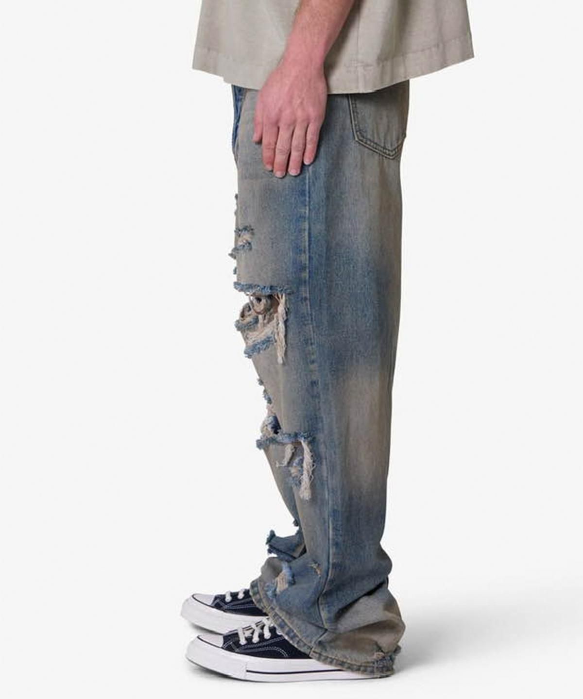 mnml独自の技術を用いて開発したヴィンテージ感あふれるオレンジダストウォッシュを採用したコットン100%のデニム生地を使用し、両足前面にハードなクラッシュ加工を施したグランジ感溢れるバギーシルエットのデニムパンツです。